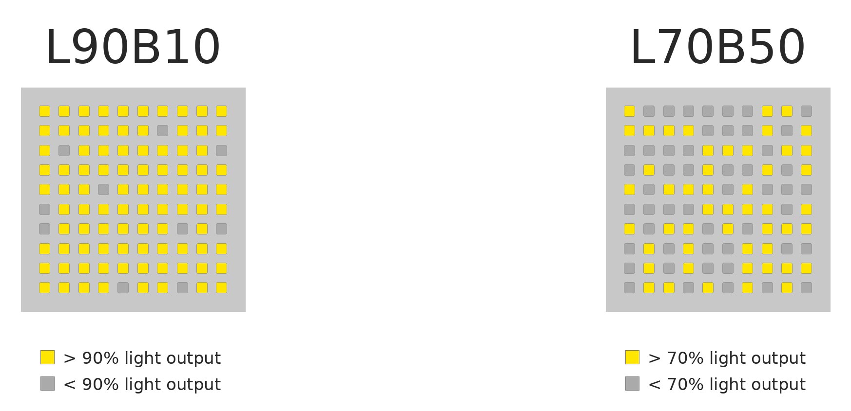 | B50 | Kuni 50% LED-idest võib olla langenud alla lubatud taseme (tulemus on ebaühtlasem). | 100 LED-ist kuni 50 tk “alla piiri” |